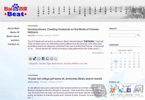 百度近日推出了“Baidu Beat”(网址: beat.baidu.com)博客网站,百度国际媒体发言人郭怡广表示,公司计划将所发现的在中国网民中最流行和最受关注的话题的文章发布到新开设的“Baidu Beat”网站上。 他同时表示,这项名为“Baidu Beat”的新服务已于今日正式上线,服务于关注中国市场的别国友人。