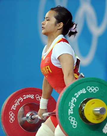 Chen Xiexia of China competes in the women's 48kg Group A snatch weightlifting competition at the Beijing 2008 Olympic Games August 9, 2008. [Agencies] |