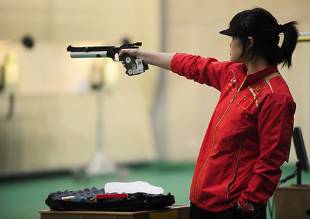 Guo Wenjun of China takes aim during the women's 10m air pistolshootingcompetition at the Beijing 2008 Olympic Games August 10, 2008. Guo won the gold medal on Sunday, followed by silver medalist Russia's Natalia Paderina and bonze winner Nino Salukvadze from Georgia. [Agencies] |