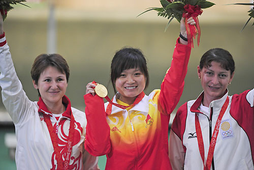 Gold medallist Guo Wenjun of China (C), silver medallist Natalia Paderina of Russia (L) and bronze medallist Nino Salukvadze of Georgia hold their medals after the women's 10m air pistol shooting competition at the Beijing 2008 Olympic Games, August 10, 2008. [Agencies] | 【已有很多网友发表了看法,点击参与讨论】【对英语不懂,点击提问】【英语论坛】【返回首页】