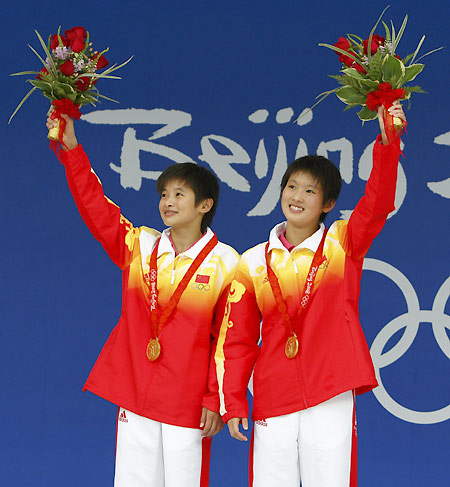 | Wang Xin (L) and Chen Ruolin of China pose with their gold medals after winning the women's synchronised 10m platform diving competition at the National Aquatics Center during the Beijing 2008 Olympic Games August 12, 2008. [Agencies] |  |