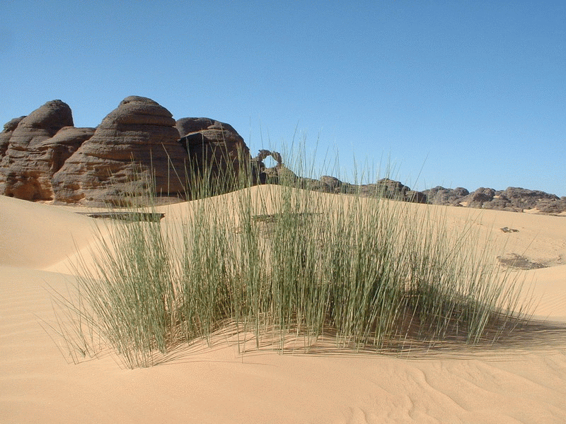 Plant Life 植物生活 The Sahara is sparsely covered with various types of vegetation ranging from grasses, shrubs, and trees in the highlands to halphytes, which are saline-tolerant plants found in saline depressions. One characteristic of the vegetation found in the Sahara is that these species must be able to adapt to unreliable precipitation and excessive heat. 草丛,灌木和树木都可以生长,这些树木的特点是能承受巨热和盐碱地带。