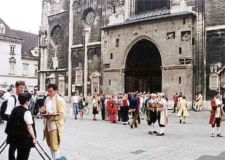 旅游胜地史蒂芬大教堂外,穿着宫廷服装的维也纳人在兜售古典音乐会门票。