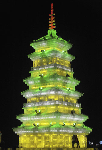 People view an ice sculpture during a preview for the upcoming 25th Harbin International Ice and Snow Festival at a park in Harbin, Heilongjiang Province, December 23, 2008. The 25th Harbin International Ice and Snow Festival will kick off on January 5, 2009, local media reported. (Agencies) |