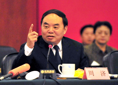 资料图片:2008年3月7日,国家教育部部长周济在宁夏代表团参加讨论。新华社记者 刘泉龙 摄