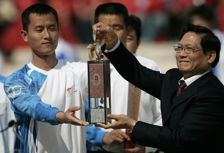 Liu Qi, president of the Beijing Olympic organizing committee, received the flame from Hellenic Olympic Committee president Minos Kyriakou at the Panathinaiko Stadium in Athens.