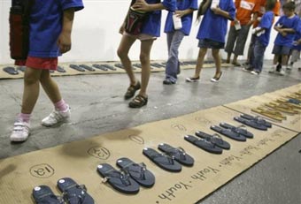 | A group of children walk up to a display of sample summer shoes of various sizes. Anti-war demonstrators in New York Thursday used children's shoes to represent dead Iraqi children.(AP) |