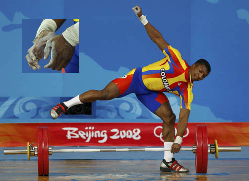 Colombian Oscar Figueroa's hand slips off the barbell in the men's 62kg Group A weightlifting snatch competition at the Beijing 2008 Olympic Games August 11, 2008.[Agencies]