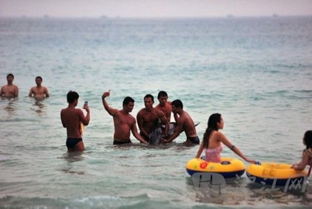 Instead of trying to help the distressed animal, a crowd gathered to line up for pictures. Several men lifted the dolphin, as long as a man is tall, above the water and one of them flexed his muscles for the camera. Online pictures do not show anyone trying to stop the abuse. 大群游客不但没有救助搁浅海豚,反而聚在一起排队与海豚照相。几个人把海豚抬起距水面一人高,还有人弯着手臂取相机拍照。网上的所有照片显示出,没有一个人站出来阻止这种虐待行为。
