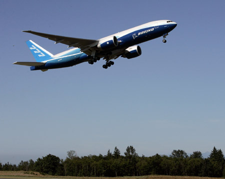 The first Boeing 777 Freighter take off on its inaugural test flight at Paine Field in Everett, Washington, July 14, 2008. [Agencies] |