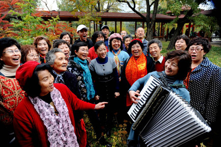 Members of a chorus formed by local seniors practice their program on the eve of the Double Ninth Festival, also Senior’s Day, in Shenyang, northeast China’s Liaoning province on October 25, 2009. The festival falls on the ninth day of the ninth lunar month. China marks the day to respect and help seniors. [CFP] 【已有很多网友发表了看法,点击参与讨论】【对英语不懂,点击提问】【英语论坛】【返回首页】