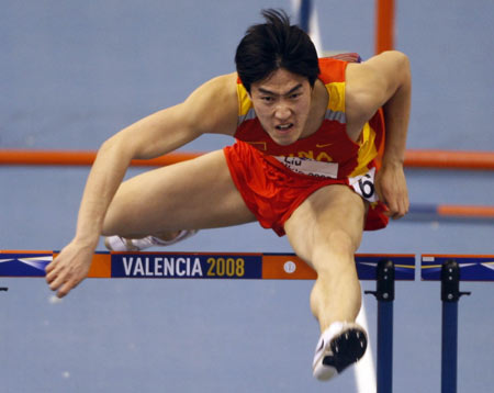 China's Liu Xiang competes to win the men's 60m hurdles final at the 12th IAAF World Indoor Athletics Championship in Valencia March 8, 2008. [Agencies] |