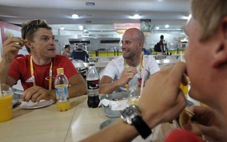 German cyclist Stefan Schumacher (centre) with his teammate Bert Grabsch (left) at the athletes' Olympic village on August 5. [Agencies]