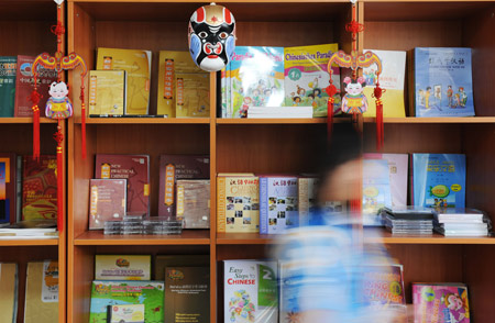 A volunteer walks pass a bookshelf at the Chinese Learning Center in the Olympic Village in Beijing, July 27, 2008. [Xinhua]