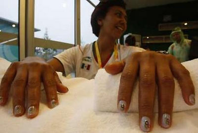 Mexico's Graciela Teran, an athletics coach for Mexico and mother of walker Eder Sanchez, displays her nails painted with Olympic Rings at the Olympic village in Beijing August 10, 2008. [Agencies]