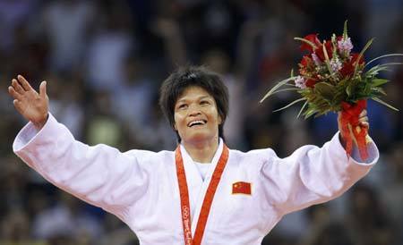 Gold medal winner Xian Dongmei of China waves on podium during the judo women's 52 kg category medal ceremony at the Beijing 2008 Olympic Games, August 10, 2008. [Agencies] |