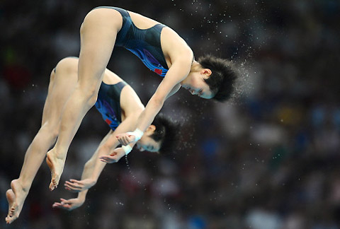 The Chinese team of Wang Xin (R) and Chen Roulin compete in the women's 10m synchronised platform diving finals held at the National Aquatics Center in the 2008 Beijing Olympic Games in Beijing on August 12, 2008. China was first, Australian second and Mexico third. [Agencies] |