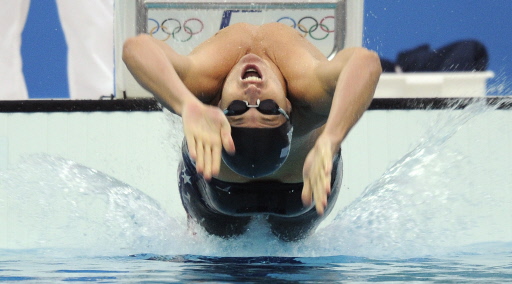US swimmer Aaron Peirsol competes during the men's 100m backstroke swimming semifinal at the National Aquatics Center in the 2008 Beijing Olympic Games on August 11, 2008. [Agencies] |