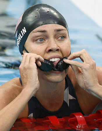 Natalie Coughlin of the US removes her goggles after her women's 100m backstroke swimming semifinal at the National Aquatics Centre during the Beijing 2008 Olympic Games, August 11, 2008. Coughlin clocked in 58.96 seconds to take the women's 100m backstroke gold medal at the Beijing Olympic Games here on Tuesday. [Agencies] |