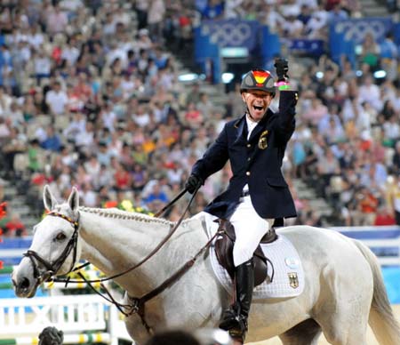 German Hinrich Romeike celebrates with his horse "Marius" during the equestrian eventing competition of the 2008 Beijing Olympic Games on August 12, 2008 in Hong Kong. Germany won gold in the three-day eventing team competition while Australia won the silver medal and Great Britain the bronze. [Agencies] |